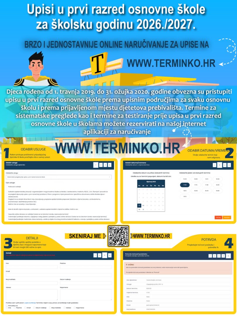 u nastavku možete pronaći upute za rezervaciju termina za sistematski pregled prije upisa u 1. razred osnovne škole putem aplikacije Terminko.